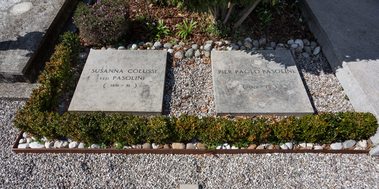 E’ meta del continuo pellegrinaggio dei tanti appassionati che vogliono rendere omaggio alla tomba di Pier Paolo Pasolini, che vi è sepolto dopo i funerali del 6 novembre 1975. La tomba del poeta, progettata dall’architetto friulano Gino Valle (1923-2003) alla fine degli anni Settanta, si trova a sinistra dell’ingresso. Si tratta di un sepolcro spartano, costituito da una lapide grigia posta sul terreno di una piccola isola verde, con la sola scritta nel carattere Bodoni caro allo scrittore PIER PAOLO PASOLINI (1922-75). La lapide è accostata a una lapide gemella, quella del sepolcro della madre Susanna Colussi, defunta nel 1981 e di seguito posta accanto a Pasolini, con richiamo al profondo legame che tenne uniti per tutta la vita il figlio e la madre.